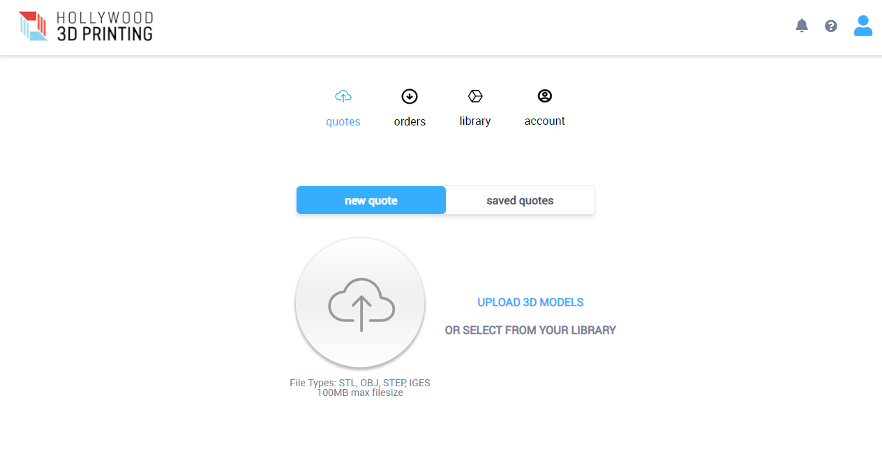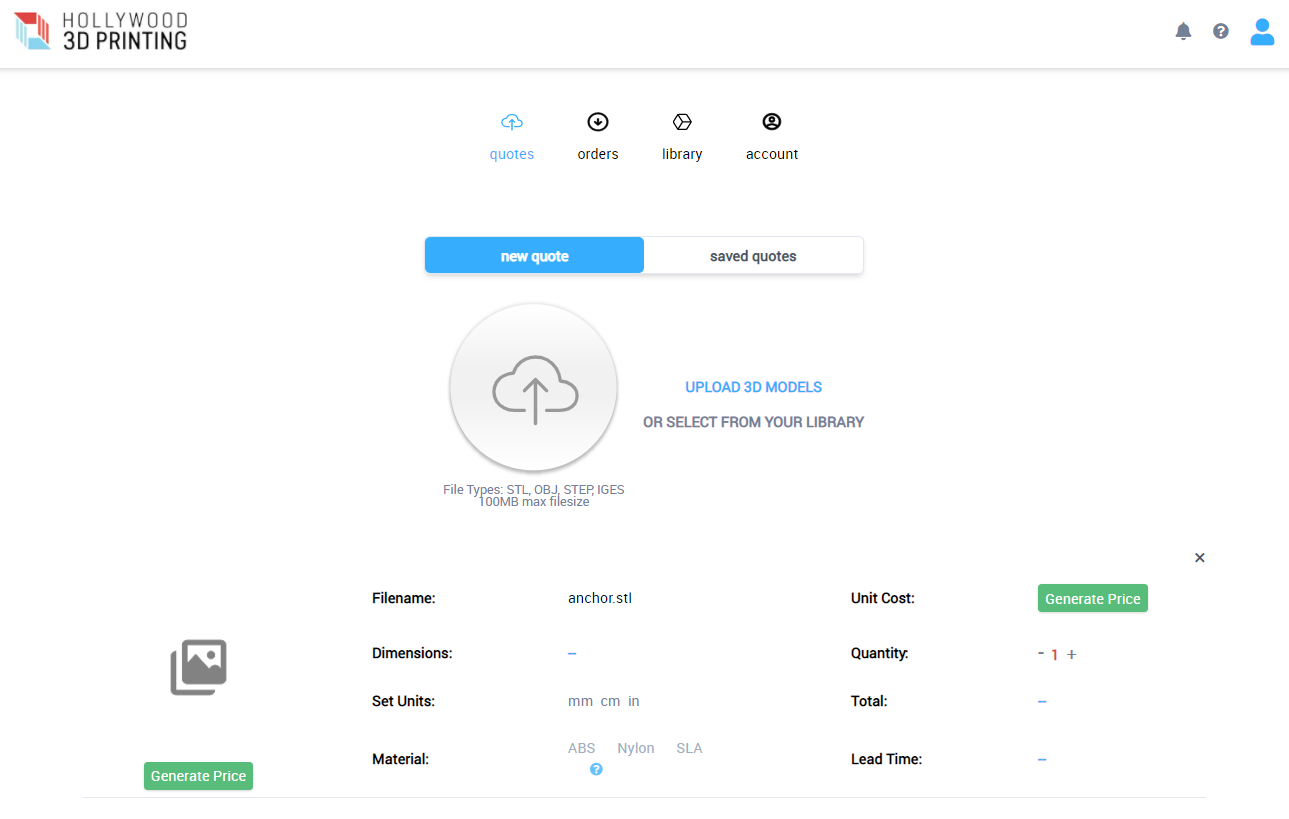 On sign-in to your Hollywood 3D Printing user account, you're directed to a blank new quote which is ready for uploading your 3D Model files in STL, OBJ, STEP, or IGES file format. This is where we're going to be uploading the STL file created in the previous step of this guide.